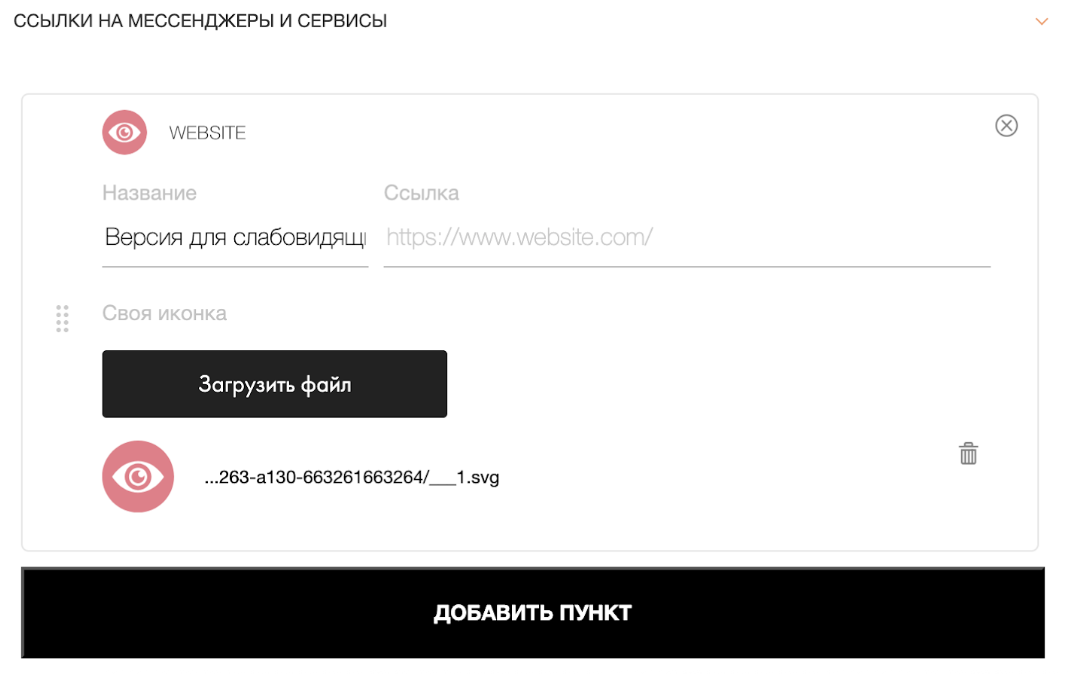 2. Добавьте свою кнопку в меню в разделе «Ссылки на месседжеры и сервисы». Можно загрузить свою иконку, а поле «Ссылка» оставьте пустым.